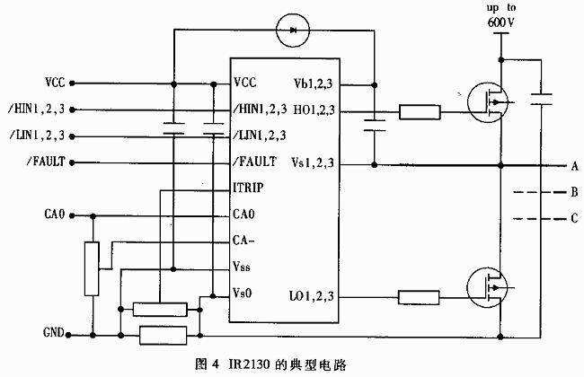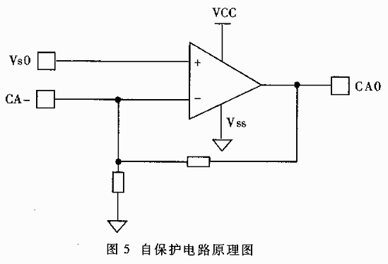 图4 IR2130的典型电路 IR2130芯片内部有电流比较电路,可以进行电机比较电流的设定。设定值可以作为软件保护电路的参考值,这样可以使电路能够适用于对不同功率的电机的控制。IR2130的典型电路如图4所示。 4 系统保护电路 在无刷直流电动机控制系统中,保护电路占据着很重要的地位,主要作用是保护控制系统的核心部件DSP免受高电压、过电流冲击,同时也保护电机的驱动电路免受损坏。整个系统的保护电路主要由三部分组成:电路隔离电路、信号隔离电路、驱动保护电路。 电路隔离电路选用内部带有隔离变压器的电压模块,把电机驱动电压控制部分的电压隔离开,分成两套供电系统:5V供电系统和24V供电系统。这样当驱动电路部分发生异常情况时,不会从电源部分影响到控制电路,实现控制电路的保护作用。 信号隔离电路主要是把控制电路和驱动电路之间的控制和驱动信号通过光电隔离器进行信号隔离,实现不同电压之间的信号传输。由于本系统中的PWM脉冲信号的输出频率比较高,为了避免信号损失和失真,这里采用6N137光电隔离器。 系统的驱动电路保护作用主要是由IR2130驱动器来实现的。IR2130驱动器保护电路主要有两部分:自保护电路和过电流欠电压保护电路。 自保护电路如图5所示。外围电路中的参考地运算放大器通过引脚VsO的设定值与流入CA-引脚的电流在反馈电阻上产生的电压相比较,如果超出设定或调整的VsO参考值,IR2130驱动器的内部电流保护电路启动关断输出通道,实现电流保护的作用。IR2130芯片内部也有硬件保护电路。如果负载或驱动电路出现过电流或欠电压的情况,IR2130驱动器的FAULT引脚会输出制动信号,通常这个输出信号接到DSP的PDPINT引脚上,拉低PDPINT引脚的输入电平,关断DSP的所有输出并置为高阻状态,实现整个控制电路的保护作用。