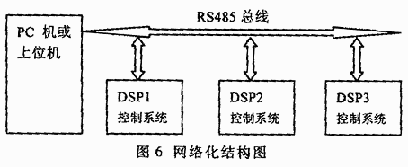 5 网络化接口设计原理 为了适应网络发展的要求,必然要求微处理器控制设备提供各种网络通信接口。传统的单片机对于网络支持不足,而新一代的微处理器已经开始内嵌网络接口,除了支持TCP/IP协议外,有的还支持USB、CAN、BLUETOOTH等通信接口,同时也提供相应的通信组网协议软件和物理层驱动软件。 通过网络控制无刷直流电动机的运行可以说是该控制系统的一个特色。通常是无刷直流电动机的控制系统都是单机控制或采用双控制器进行控制,很少通过网络来控制。本控制系统采用RS485通讯接口进行网络化数据传输。主要的网络传输示意图如图6所示。上位机或PC机为每个控制模块软件分配地址,发送数据给每个模块,而主机在发送数据时主要是通过分配给每个模块的地址识别发送对象。网络系统上电后,在进行网络初始化之前,除了主机的组地址和地址可以确定外,所有驱动器模块组地址和地址都是0xFF,表示该驱动器模块只在0xFF这个全体组内,且地址没有初始化。由硬件的连接方式决定,此时网络的下一个驱动器模块处于等待网络初始化指令状态,主机应当发送一个地址分配指令对该驱动器模块进行地址分配。一旦该驱动器模块地址分配成功,它便通过硬件向下一个驱动器模块传递信息,表示自身已经分配完毕。然后主机的下一个地址分配指令将作用于下一个驱动器模块。这个过程将一直持续下去,直到主机在发送地址分配指令后收到分配成功的反馈信息为止,此时表示没有需要分配的驱动器模块了。至此网络初始化完毕。在网络已经建立好的情况下,主机可以通过发送网络复位指令,使所有驱动器模块复位为刚上电的状态,然后再次进行初始化,即提供了网络“热”重建能力。