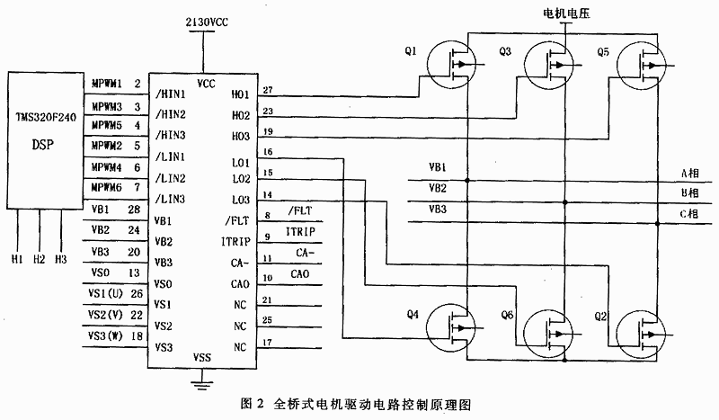 直流电机产生的霍尔元件信号通常高低电平相互覆盖。而对电机驱动桥路的控制需要根据检测到的三个霍尔元件的每一次跳变,来触发控制器进入中断响应,同时还要记录霍尔元件的状态。因此在设计中对三个霍尔元件做两步处理:首先把三个霍尔元件的信号接到TMS320LF240的三个I/O引脚上,记录当前的状态;然后把霍尔元件信号作为三路输入接到CPLD的I/O口,通过编程实现一路连续的窄脉冲输出,接到TMS320LF240的CAP3引脚上。每一个脉冲触发一次中断,控制驱动桥路的导通顺序,并根据当前的霍尔元件状态信息对电机的转速和正反转进行控制。 3 驱动电路 电机控制的驱动器采用IR2130芯片。IR2130/IR2132(J)(S)是一种高电压、高速度的功率MOSFET和IGBT驱动器,工作电压为10~20V,分别有三个独立的高端和低端输出通道。逻辑输入与CMOS或LSTTL输出兼容,最小可以达到2.5V逻辑电压。外围电路中的参考地运行放大器通过外部的电流检测电位器来提供全桥电路电流的模拟反馈值,如果超出设定或调整的参考电流值。IR2130驱动器的内部电流保护电路就启动关断输出通道,实现电流保护的作用。IR2130驱动器反映高脉冲电流缓冲器的状态,传输延迟和高频放大器相匹配,浮动通道能够用来驱动N沟道功率MOSFET和IGBT,最高电压可达到600V。 IR2130芯片可同时控制六个大功率管的导通和关断顺序,通过输出HO1,2,3分别控制三相全桥驱动电路的上半桥Q1、Q3、Q5的导通关断,而IR2130的输出LO1,2,3分别控制三相全桥驱动电路的下半桥Q4、Q6、Q2的导通关断,从而达到控制电机转速和正反转的目的。