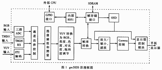 gm5020是加拿大genesis公司为液晶显示器(LCD)和其它点阵显示器生产的高度集成的图像处理芯片,具有以下主要的特征:   (1)三个ADC输入(RGB),作为计算机显卡的输入;   (2)一个8-bit ITU-R BT656视频输入信号(YUV)端口;   (3)一个数字视频交互接口(DVI),内含高带宽数字信息加密保护(HDCP);   (4)具有图像放大/缩小/冻结功能;   (5)具有在屏显示(OSD)控制的功能;   (6)片内有8051结构的单片机;   (7)具有帧率转换(FRC)控制的功能;   (8)视频工作频率高达160MHz;   (9)最高分辨率SXGA为1280×1024;   (10)提供一个支持平板显示器(LCD或PDP)的输出接口和一个支持CRT显示器的输出接口;   (11)提供一个9线双向的数据接口(GPIO)与外部的MCU相连;   (12)一个2线I2C接口和一个6线I2C接口;   (13)具有调节RGB和YUV信号的色度、对比度、亮度、饱和度的功能。   gm5020的供电电压为3.3V,采用292pin和27mm×27mm的PBGA封装形式。gm5020原理框图如图1所示。   除四个外部时钟外,所有时钟都是由gm5020内部通过直接数字同步(DDS)来产生所需要的同步时钟。   gm5020有两种复位方式:硬件复位和软件复位。硬件复位指gm5020的reset脚(T1)接低电平1μs后使gm5020复位。软件复位指通过设置寄存器HOST_CONTROL的位SOFTWARE_RESET=0使gm5020复位。   gm5020可接收三种输入数据模式:(1)24bit RGB;(2)8bit ITU-RBT656(CCIR626 422);(3)数字视频交互信号DVI。   gm5020能够测量输入视频信号的行扫描(HS)和场扫描(VS)时间参数,用于检测输入视频信号是否改变和确定输入视频信号的模式。   gm5020能够对捕获的数字图像数据进行背景、亮度、色度、对比度、饱和度调节。   有相互独立的水平和垂直两个方向的放大和缩小功能,其值由输入图像尺寸和放大图像尺寸所确定。   通过帧存储接口实现视频输入数据和视频输出数据的帧率转换(FRC)。   gm5020提供两个OSD模式:字符模式和图形模式。字符模式支持4种颜色字体同时显示,图形模式支持256种颜色显示。OSD可以在内部SRAM或外部扩展SDRAM存储字表或位图。通过对OSD寄存器的设置,可以控制其字型、尺寸、显示位置颜色、闪烁、背景透明、背景不透明、旋转等功能。   Gm5020提供一个支持平板显示器(LCD或PDP)的输出接口和一个支持CRT显示器的输出接口,输出接口信号包括18bit和24bit RGB像素数据,显示允许(DEN)、显示时钟、行同步(DHS)和场同步(DVS)等信号,所有显示的数据和时钟与输出时间DCLK同步,其显示可通过I2C接口编程控制。