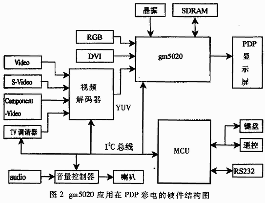| 摘要:gm5020是加拿大genesis公司为液晶显示器和其它点阵显示器产生的高度集成的图像处理芯片,介绍了该芯片的特点、功能、原理。并利用gm5020设计了等离子彩电,给出了其硬件结构和软件流程。     关键词:等离子彩电 在屏显示 gm5020   等离子彩电能安全避免辐射,是100%的绿色环保电视。由于不受磁气和磁场的影响,具有机身纤薄、重量轻、屏幕大、色彩鲜艳、画面清晰、亮度高、失真度小、节省空间等优点。等离子彩电(PDP)实现电视、电脑、电讯的三合一,直接满足了宽带多媒体信息网的要求。PDP电视是目前彩电大型化的方向之一,在未来的数码时代将逐步取代体积巨大的盒体状CPT显示器而成为未来彩电市场的主导产品。世界上最大的几家PDP生产厂家纷纷宣布推出了PDP新产品,昭示着PDP已开始跃上显示器市场的大舞台。但是,PDP价格高昂,严重制约了它的普及。   采用gm5020设计平板显示器,具有简单、灵活、费用低等特点,国内外大多数液晶显示器都采用了这种芯片。我们用gm5020设计等离子彩电,借以实现降低等离子彩电的成本。