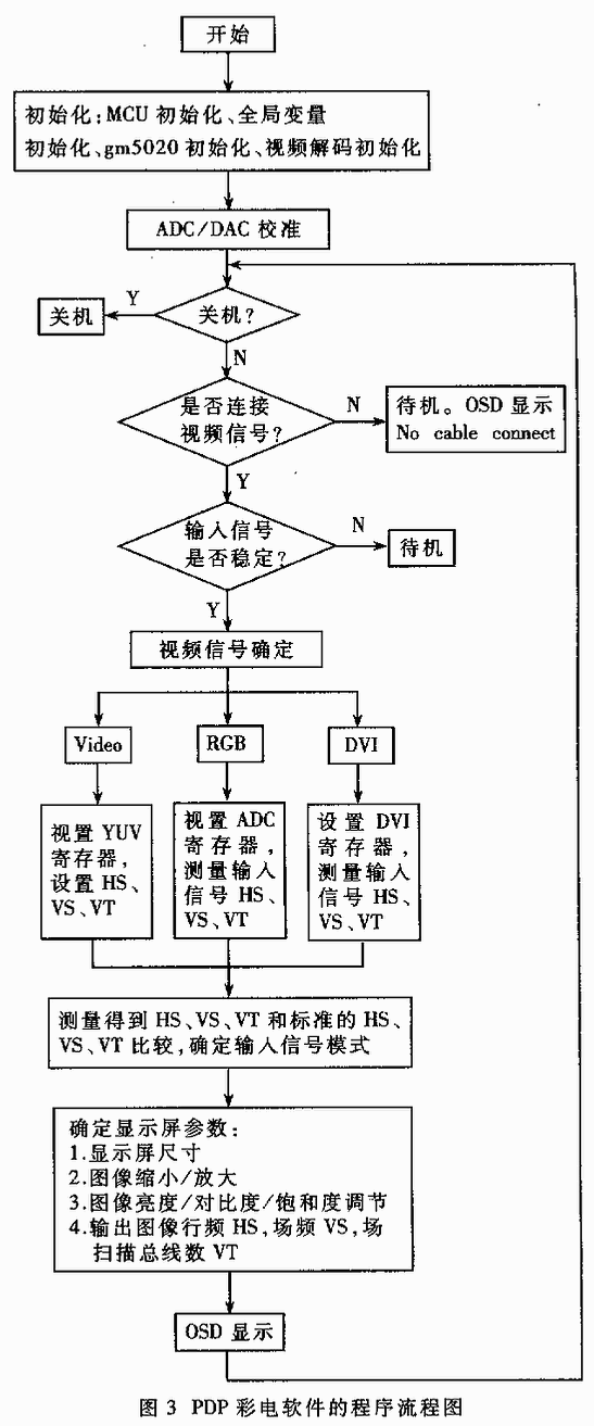 PDP平板显示系统中软件的程序流程图如图3所示。系统软件主要分为三大部分:   (1)初始化:主要包括MCU初始化,全局变量初始化,gm5020内部MCU初始化,视频解码初始化。   (2)输入信号模式检测:自动识别Video、NTSC/SECAM,支持显示Video、S-Video、Componen-Video。侦测无信号输入状态并提示,1分钟后处于待机状态。   (3)用户参数设置:①显示屏尺寸。②图像缩小/放大,具有16:9,4:3两种画面切换。③图像亮度、对比度、饱和度调节。④输出图像行频HS,场频VS,场扫描总线数VT。⑤图像位置调节:图像位置左右、上下移动,图像位置左右、上下倒置。⑥图像冻结。 |