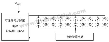 |  图1 驱动LED阵列的基本SMPS路 |  选择电路拓扑结构 对于这种应用,选择了降压拓扑结构。输入电压的限制(VBATT =9 V min.) 和阵列的正向压降(2xVF=8.0 V,VFMAX=4 V@IF=350 mA)确定后,期望采用降压拓扑来满足这些要求是合理的。其他驱动LED的方法是用开关方式产生/稳定电压,然后通过脉冲宽度调制方式调节流过LED的电流。在LED和开关的路径上,需要串联一个限流电阻,以避免流过的电流过大,造成潜在的损害。这个串联电阻消耗功率,也会导致效率降低。 但是,SMPS本身具备有利于稳流的元件。降压调节器的简化电路如图2所示。