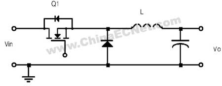 |  图2 简化的降压调节器电路图 |  更仔细的观察这个设计中的储能元件可以发现一些有趣的观点。通过电感的电流可以看作既是交流也是直流元件。考虑SMPS的电感在连续模式中工作的情况 (通过电感的电流波形参见图3)。 在这个应用中直流元件特别令人关注。因为电流是关键参数,所以调节电流并向负载提供是这个电路的主要目标。还应该记住把交流元件减到最小的目标。