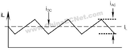 |  图3 连续模式流过电感中的电流波形 |  另外,因为不考虑输出电压,而且它会随着LED 器件而改变,因而不需要像传统稳压电路一样考虑这个节点的稳压任务。当电感进行充电并且帮助向LED 阵列提供能量时,输出电容在此期间提供电流。传统稳压器的这个元件将保留。 选择控制器