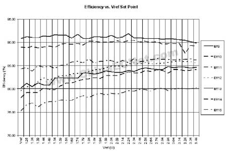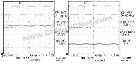 |  图7 VBATT=13.8V且Lout=Max(左),Min(右)时的典型工作波形(略) |  下面简单地探讨效率问题。以下讨论参见图8。可以看到,电路一般在较低的输入电压和较重的负载时效率最高。在所有工作情况下,总的效率不会低于75%。