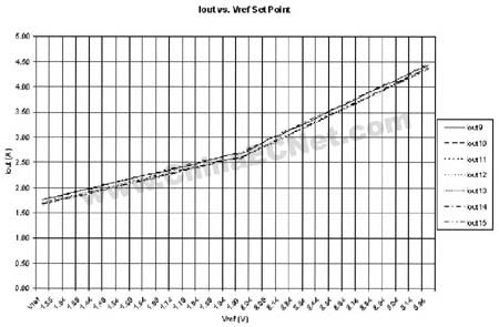 |  图6 电流输出范围 |    性能 按照原理图建立电路后,得到了以下性能数据。首先,绘出实际的输出电流IOUT ,作为是可编程参考电压VREF的函数的曲线。VREF可以从1.340 V 到2.090 V以50 mV的步长,以及在 2.140 V 到 3.540 V以100 mV的步长进行选择。其性能在图6中一目了然。 图6中所画的值代表9 V 到15 V测试输入电压的工作情况。注意到设置值从50 mV 步长变到100 mV 步长处有清楚的反射点。通过改变RSENSE1的值可以简单的改变此电路的总体工作范围。也注意到对于各种输入电压,IOUT 的改变很小。 下面的一组工作波形如图7所示。注意到工作频率发生改变,因为 CS5165A 是一个恒定关断时间的控制器。元件C12设置了关断时间的值。关断时间保持固定,而导通时间会根据负载要求而改变。在这种情况下,负载电流改变,将增加LED 阵列上的压降。在经典的稳压器中,占空比根据步降电压比改变。因为电压比随不同的负载电流有效的改变,占空比也发生变化。注意到图7中的波形测量值就可以得出这些结果。也要注意通过L1的纹波电流。